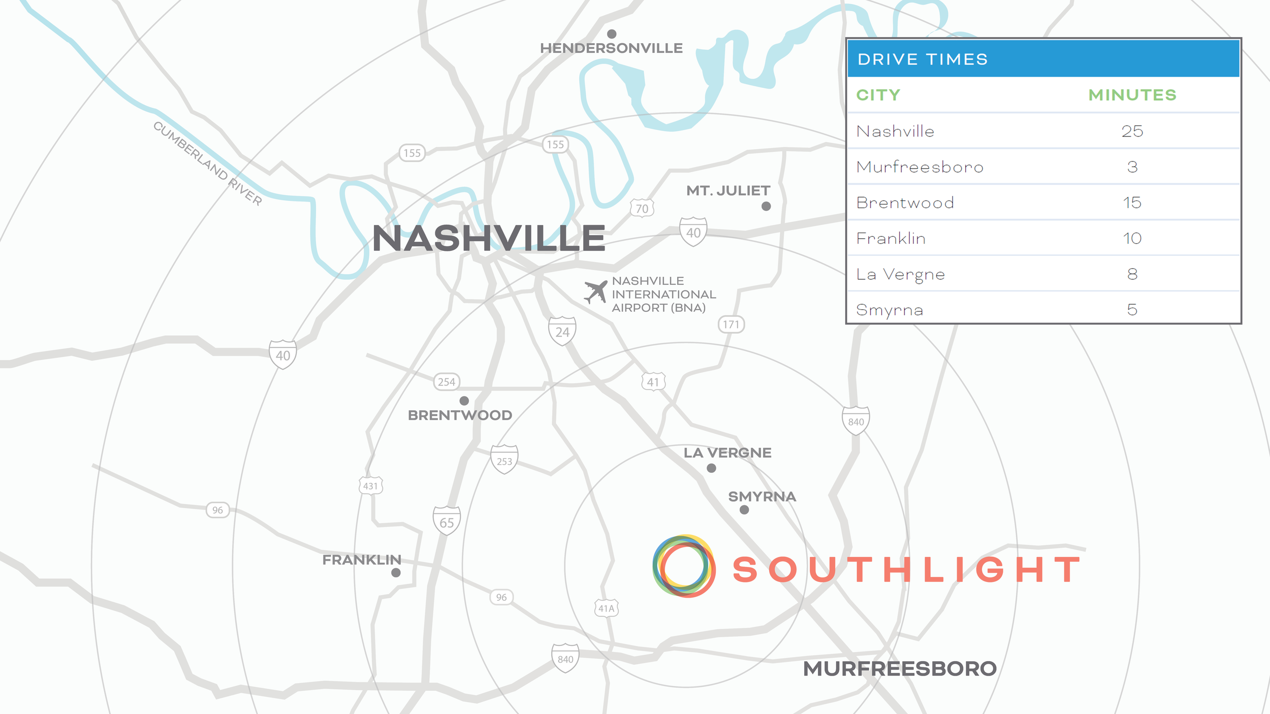 Perfectly positioned near the I-24 and I-840 exchange, southlight offers seamless connection to Nashville, Murfreesboro, and the I-65 corridor including Franklin and Brentwood. The community’s optimal location places residents at the heart of Middle Tennessee’s fastest growing corridor. And with the Nashville International Airport just 30 minutes away, travelers will enjoy incredible access to major cities across the country. From here, anywhere and everywhere is in easy reach.